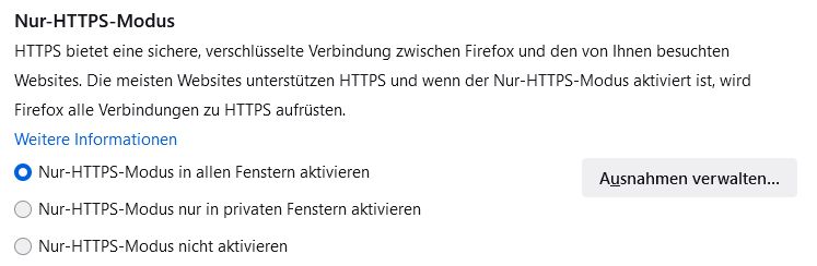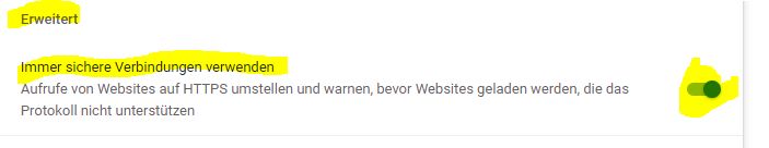 unter Einstellungen–>Datenschutz & Sicherheit –>Nur-HTTPS-Modus einstellen: