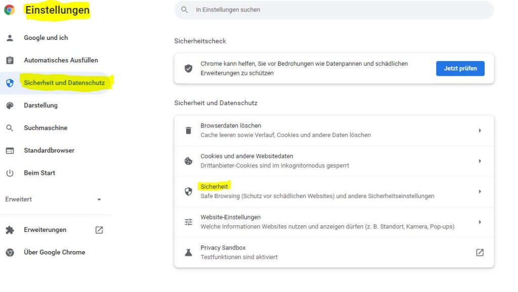 Einstellungen–>Sicherheit und Datenschutz –>Sicherheit auswählen
